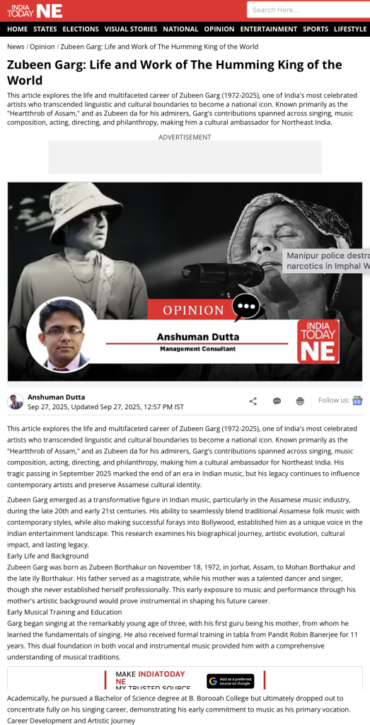 This article explores the life and multifaceted career of Zubeen Garg (1972-2025), one of India's most celebrated artists who transcended linguistic and cultural boundaries to become a national icon. Known primarily as the "Heartthrob of Assam," and as Zubeen da for his admirers, Garg's contributions spanned across singing, music composition, acting, directing, and philanthropy, making him a cultural ambassador for Northeast India. His tragic passing in September 2025 marked the end of an era in Indian musi