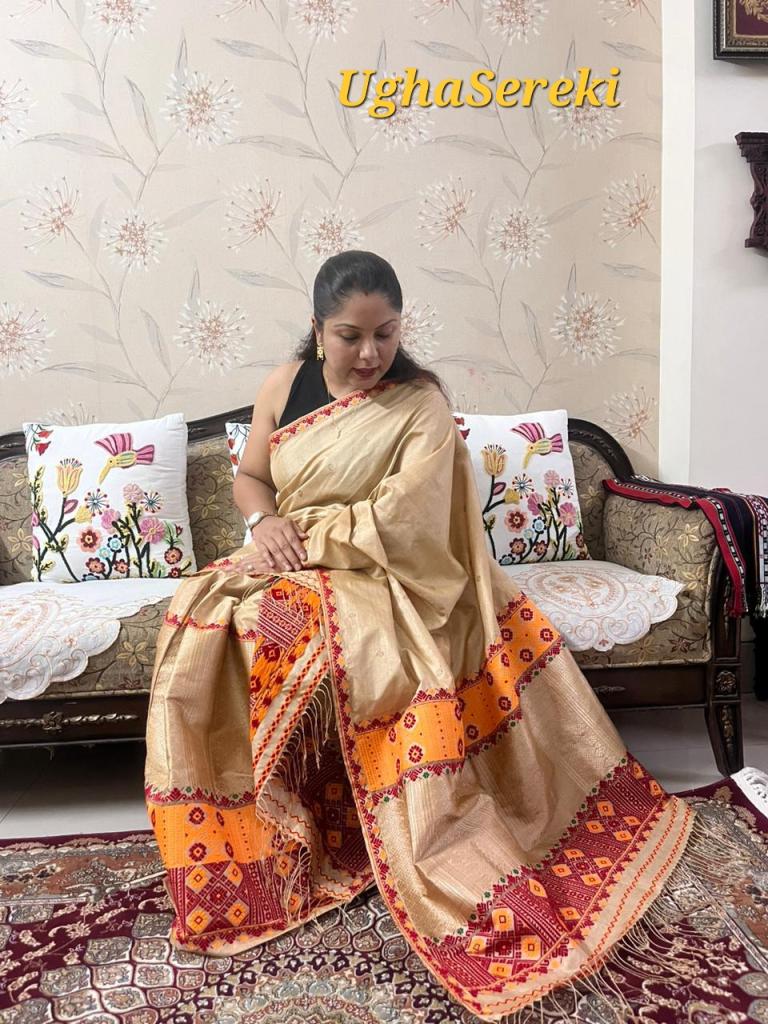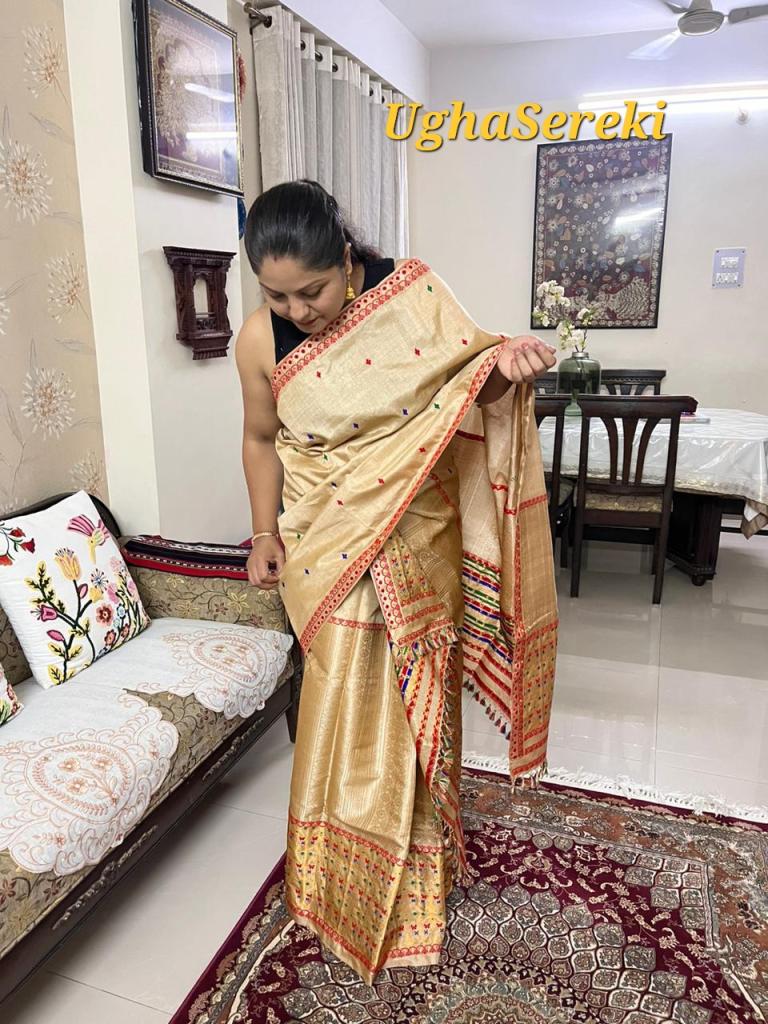 I have started my clothing business under the brand name ‘UghaSereki’,three years ago which deals in hand woven muga and Tussar silk Mekhela Chador designed by me with an aim to supply authentic products to people with affordable prices and also to make the rural women empowered. The Muga Silk is GI tagged to the State of Assam in India and it is known for its durability and has a natural yellowish golden tint with a shimmering and glossy texture.