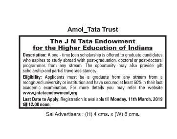 Meritorious students aspiring to go abroad for higher studies may be encouraged to apply before the due date. Registration for application form is available till 11th March, 2019 by 12.00 noon. The last date for the receipt of completed applications is 18th March, 2019.