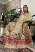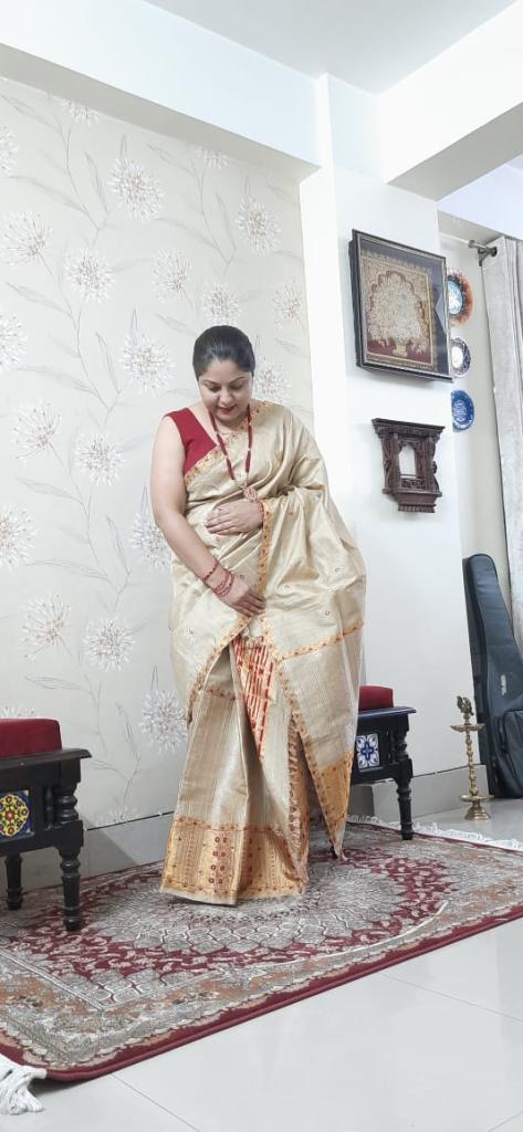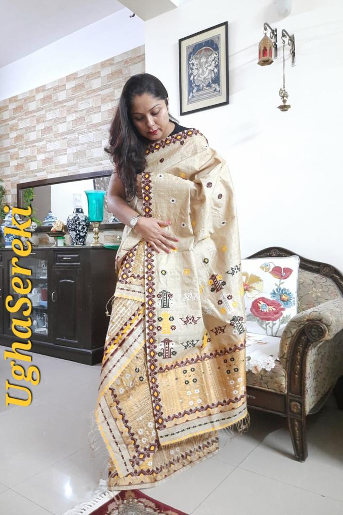 I have started my clothing business under the brand name ‘UghaSereki’,three years ago which deals in hand woven muga and Tussar silk Mekhela Chador designed by me with an aim to supply authentic products to people with affordable prices and also to make the rural women empowered. The Muga Silk is GI tagged to the State of Assam in India and it is known for its durability and has a natural yellowish golden tint with a shimmering and glossy texture.