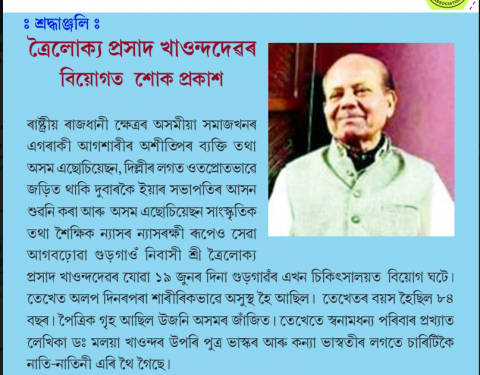 Jogajog - the monthly newsletter of Assam Association Delhi  for the Month of  July    2021 is attached.  The important news published  are viz.1.      Editorial -  Appeal has been made by editor to esteem readers   to  share their  important news to publish in Jogajog  through  whatsapp Number   98737638112.      Thanks giving letter from  Hon’ble Chief Minister of Assam  to Assam Association Delhi .  3.      Shardhanjhali to  Trailokya Prasad Khaund held  A  shardhanjali  meeting was   organised by Assam Association Delhi yesterday dated 20th June at 7:45 PM  through Google Meet   to pay the last respect  to  T. P. Khound  who  left for his heavenly abode  on 19th June 2021 after brief illness.  T P Khaund was Ex President , Assam Association Delhi and  Trustee of  Assam Association Education and Cultural trust .  He was  Retd (IAS ) officer and worked  on several important assignment  during his service  viz Resident Commissioner, Principal Adviser   to Governor , etc   During the  meeting, Dr Nilamani Sarma briefly described about his life and his long association with Assam Association, Delhi.  Other prominent speakers were viz. Achyut Saikia, Dr M P Bezbaruah, , Hiranya Kumar Das, Sarat Borkakoty   Dr. Jayantimala Devi ,  Smti Trishna Borkakoty  Dr Bipul Baruah, , Angshuman Baruah , Smti Reem Pathak  etc.  The condolence message of Smti Anjali Barooah was conveyed as she  was out of Station.   At the  end,   one minute silence was observed  to pay homage to Sjt T P Khaund The recorded video of the above  is Shardhanjhali is  available at https://youtu.be/R1SbgNeBkvo    4.      Bishnu Rabha Divas Observed in Delhi   New Delhi  21st June 2021   Assam Association Delhi  celebrated   “ Bishnu Rabha Divas”  on 20th June 2021 from 8:15 PM onwards thorough Google Meet  which was attended by around 80  participants from various parts of the world. An attractive cultural event was also organised to mark the event. Each year , Rabha Divas is celebrated on 20th June as  tribute to  the  death anniversary of Sri Bishnu Rabha.  The guest of honour of  the event was Sri  Prithviraj Rabha , son of legendary Bishnu Prasad Rabha who joined from   Tezpur.  In his  speech , he described various significant incidents of his father i.e.   late Bishnu Rabha during his lifetime.  Currently Sri  Prithviraj Rabha  is the  MLA from Tezpur constituency, Assam. Prior to his speech , Sri Prasanta Kumar Das  gave a  brief introduction about Sri  Prithviraj Rabha to the participants and Dr Nilamani Sarma  described  about Assam Association Delhi to Sri Rabha.Later , a  few prominent personalities spoke briefly   about Sri Bishnu Rabha. Dr Sangeeta Kakoty, renowned Artist from Assam   told  how Sri Rabha  was instrumental in bringing    transfusion of various  music of other parts of the country  into  Assamese music . Sri Bhupen Uzir and  Smti Santa Uzir described about deep  essence inside   Rabha Sangeet . A few other notable  speakers were i.e. Smti Jonali Talukdar , Smti Naba Mallika, Kishorima Kashyap Saikia  and  Mrs Jonali Dutta. During the cultural program several artist performed  viz.           Live1.      Dr Sangita Kakoty,  Song2.     Sri Bhupen Uzir & Santa Uzir  Song3.      Smti Sibani Baruah , Song4.      Smti Reem Pathak, Song5.      Sri Ankur Dutta , Song6.      Dr Banahit Mazumdar , Instrumental7.      Kishorima Kashyap Saikia8.      Smti Zhim Pathak . Song9.      Nilay Das , Song10.  Smti Sangeeta Borthakur, Song11.  Smti Jonali Talukdar , Song12.  Smti Naba Mallika, Song13.  Smti Sangeeta Das Sibf14.  Smti Irani Saikia, Song etc.Other singers  who performed through sharing their recorded video were  viz.1.    Smti Vishalakshi U Kashyap Dance  2.    Smti Sibani Baruah Song  3.    Smti Murchana Sarnah Song  4.    Smti Aparna Devi Teacher, Assam Jatiya Bidyalay. Noonmati Guwahat Dance5.    Smti USHRIA PRITOM's Dance Performance on "BISWAR CHANDE CHANDE"6.    Mrs Boruah Ahmedabad7.    Smti Anshikaa Shivam Dance8.    Dr. Dhrubajyoti Sahariah, Mangoldoi, Recitation9.    Smti Barnali  Dutta Bora  Song10.  Smti Bhargavi Kashyap Age - 11 yrs Class - VIC/o Dr Bhupen Deka IIT GUWAHATI11.  Smti Parijat Nath, Age 13, Daughter of Kiran Nath & Manisha Devi, Tezpur12.  Sri Jayditya Saikia Song13.  Dhanistha Saikia Song14.  Sri Madhurjya Sarma Music Keyboard15.  Sri Debajit Baruah   Music Guitar  16.  Pragya Priya Baruah. Recitation  17.  Sushubhan Talukdar Song18.  Smti Nijara Nath Dance19.  Smti Reem Pathak  Song20.  Sri Rajdeep Das etcThe entire program was recorded and made available at https://youtu.be/Z1NCg8XctqcThe event was moderated by Dibyojit Dutta and  managed by  Reem Pathak, Angshuman Baruah and Prasanta Kr Das. 5.      Obituary     Smti Neelakshi Borgohain W/O Late Gunin Borgohain  breathed her last on 1st May  due to Covid-19  in a hospital in NOIDA.  She was only 40 years old at that time.  She left behind two little daughters.  Tragically, she had lost her husband Gunin Borgohain a few years before i.e. on 16th September  2018. 6.      General Body meeting of Sahitya Xora held on 27th June 2021 7.      Sodou Axom Lekhika Samaroh Samiti , Delhi Chapter Remembers Sheela Barthakur  -  Sodou Axom Lekhika Samaroh Samiti, Delhi Chapter organised a virtual meeting on June 21 to remember and pay tribute to Late Sheela Barthakur on her first death anniversary. Sheela Barthakur passed away on June 21, 2020 at the age of 84 years. Late Sheela Borthakur is the role model of all the women writers of Assam . She is the founder president of 'Sa