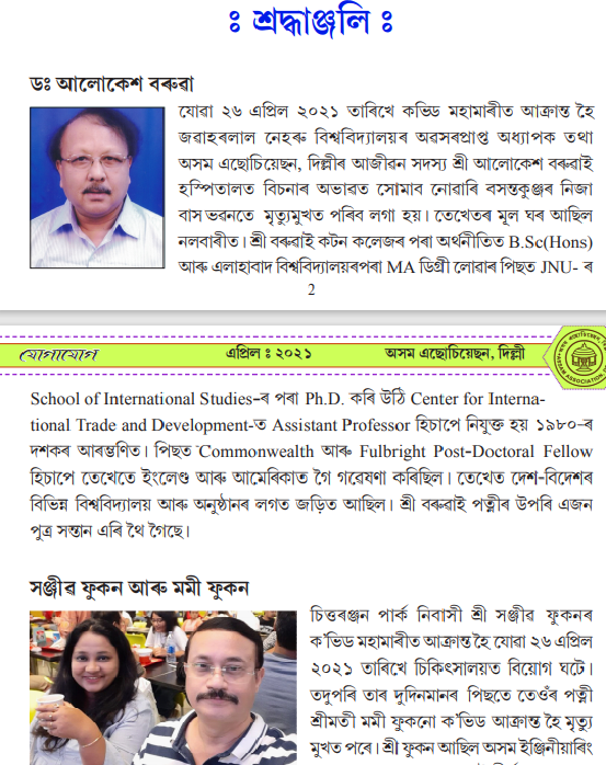 Jogajog - the monthly newsletter of Assam Association Delhi for the Month of May 2021 is attached. A few important news published here are 1. Obituary to a few colleagues/ friends who had to leave us forever due to the ongoing 2nd wave of Covid Pandemic viz. a. Dr Alakesh Baruahb. Sanjib Phukan & Moni Phukanc. Kalyan Baruah and Neelakhsi Bhattacharyyad. Mridul Bhuyane. Amiyo Bezbaruahf. Dr Dimbeswar Borag. Col Ajit Dutta & Anuradha Duttah. Dr Satyapriya Baruahi. Bandana Duttaj. Utpal Senapatik. Dr Rajorshri Kalital. Dr Joyeeta Bhattacharyyam. Dr Pankaj Kr Medhi 2. Assam Association Delhi has proposed to Establish one Covid Health Centre at Srimanta Sankaradev Bhawan 3. Oxygen ATM by Helping Hands for SOS NE covid patients in Delhi. Vol : 13 No:08 Sl No: 148